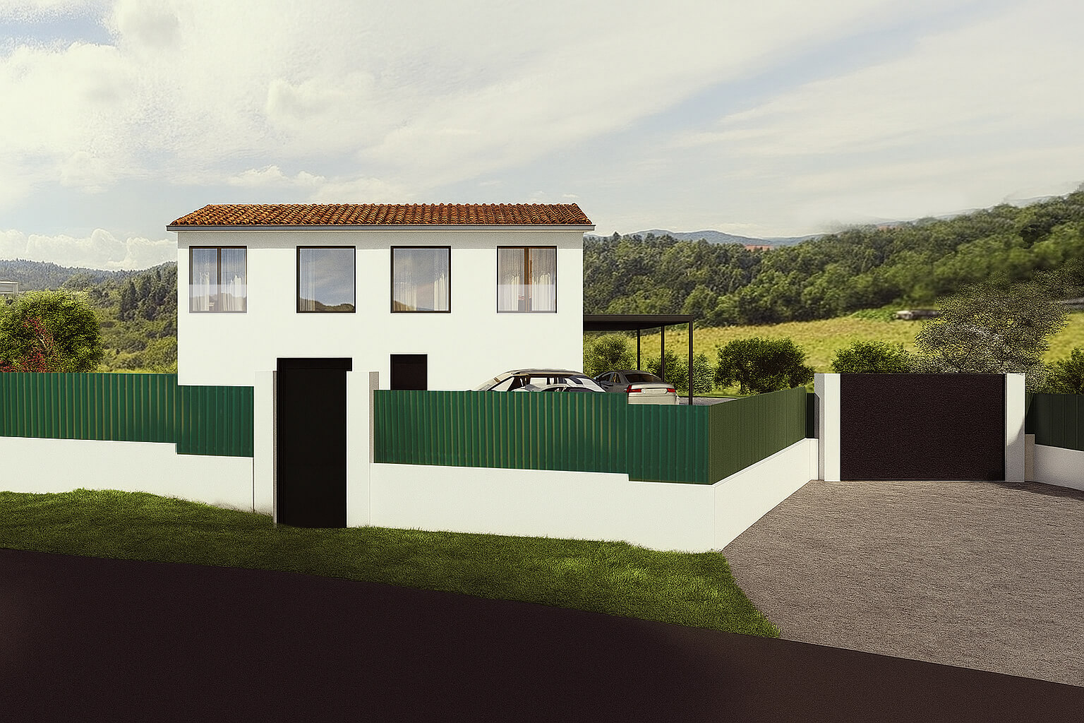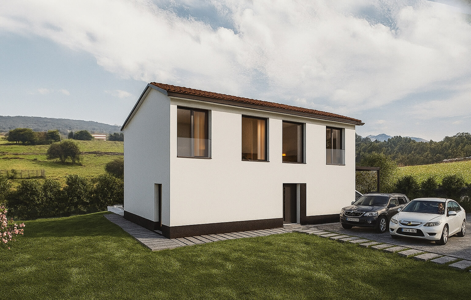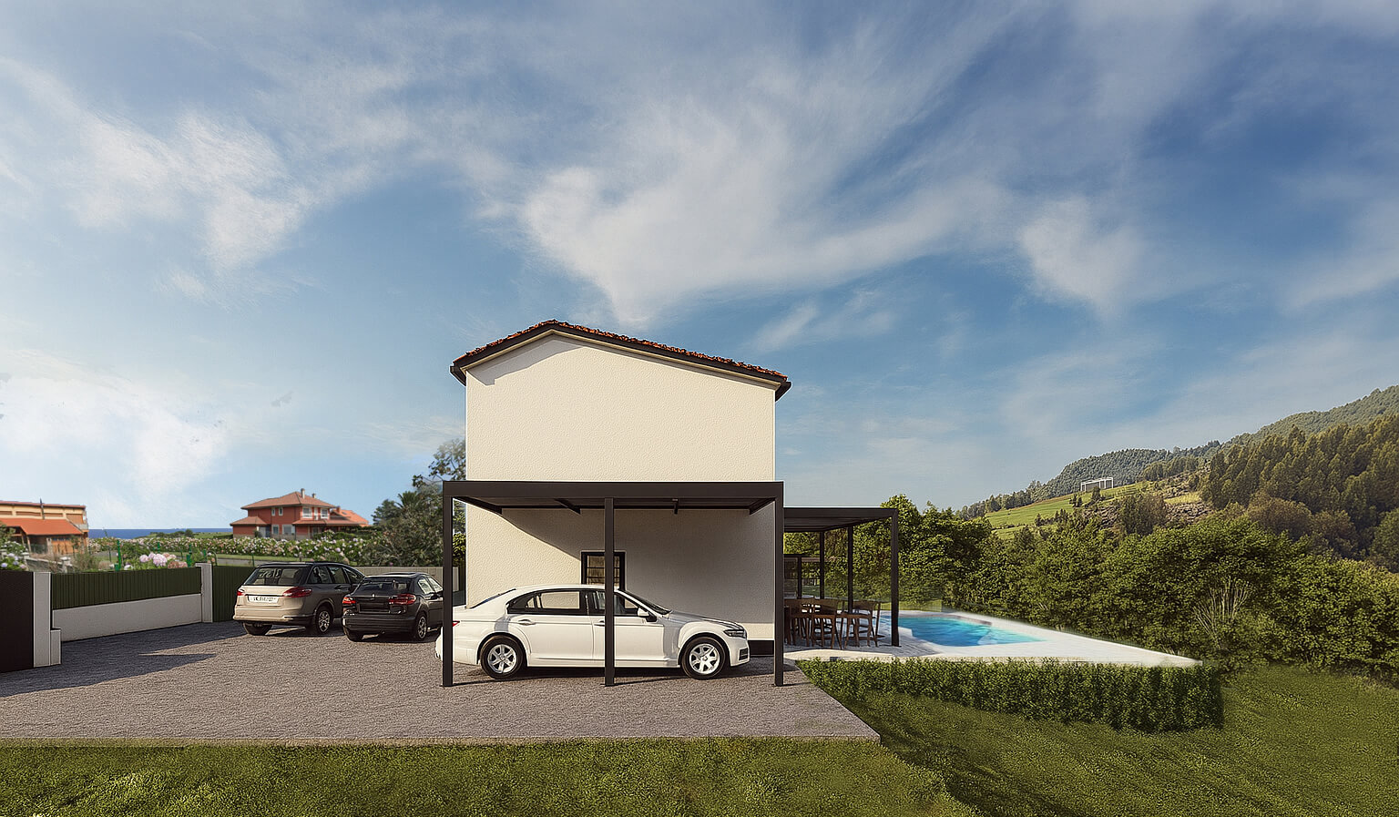 Se apuesta por fachadas de colores claros con revestimiento SATE y cubiertas inclinadas acabadas en teja, logrando un resultado estético que se integra con el paisaje y refleja la identidad del proyecto.