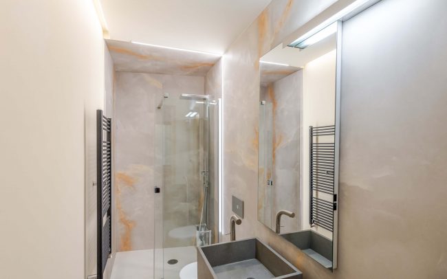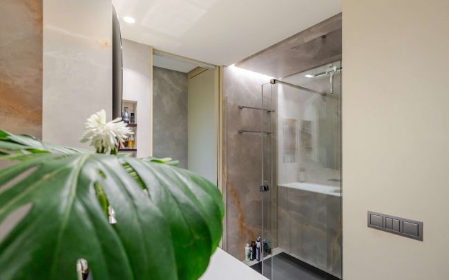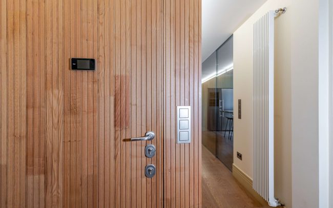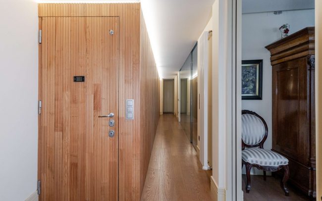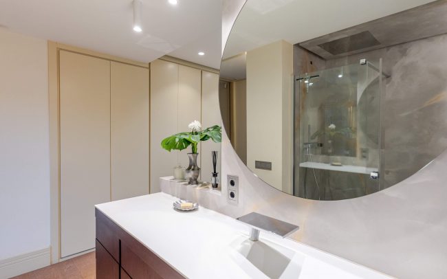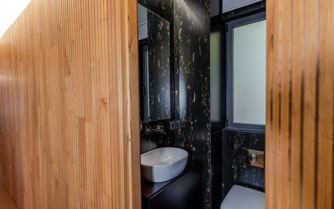 Las estancias ubicadas a la zona secundaria (que no cuentan con vistas) son las zonas no principales para los promotores: un dormitorio de invitados, zona de lavado y aseo. Se encuentran “ocultos” mediante un acabado del distribuidor de madera -incluidas las puertas-, con lo que conseguimos un pasillo homogéneo, que no se ve interrumpido por el ritmo de las puertas y que por tanto no rompe la estética que se buscaba conseguir.