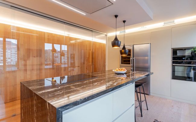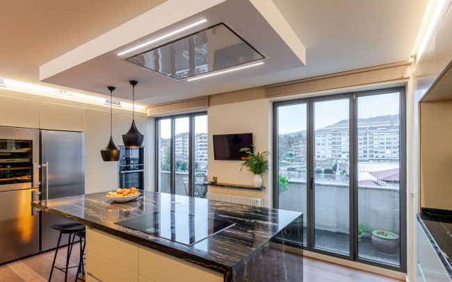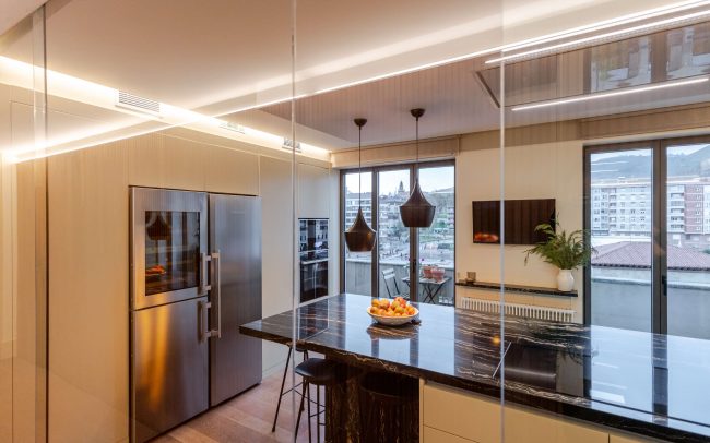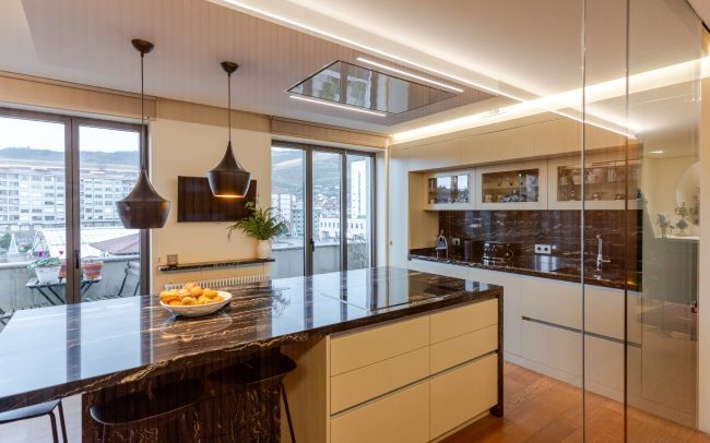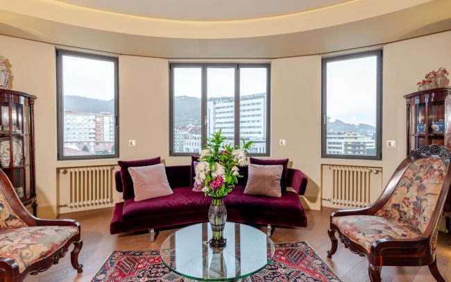 Siempre tenemos en cuenta la gran importancia tanto de la luz natural como de las vistas, y este piso es perfecto en ambas. Al estar ubicado al final de la calle Uría en cruce con la Avenida de Santander, dispone de una gran amplitud de vistas hacia el monte del Naranco. Estas vistas y la entrada de luz se magnifican al colocar ventanas con un perfil metálico reducido que amplían la superficie de vidrio disponible en el hueco.