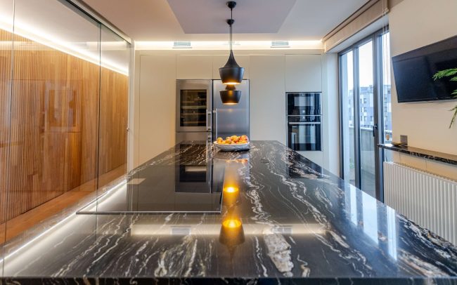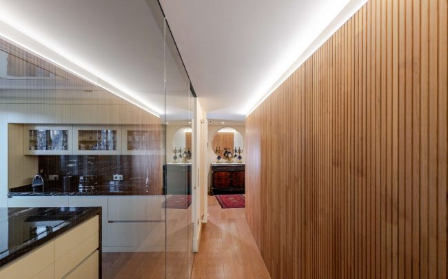 Nuestra propuesta se basó en mantener la linealidad presente del pasillo, pero abriéndolo a la cocina, que ahora se ubica en el lugar central de la vivienda. Además, al cerrarse la cocina mediante una pared de vidrio con puertas también de vidrio, no existe nunca la sensación de un pasillo simplemente distribuidor de las zonas.
