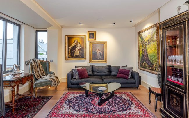 A ambos lados de la cocina se ubican las otras zonas que más importancia buscaban dar los promotores: el salón-comedor, el despacho y el dormitorio principal. El salón se ubica en la zona curva del edificio, dotándolo así de dos zonas diferenciadas dentro de un mismo espacio de 46 m2. El dormitorio principal se distribuye por las dos zonas del piso, al ubicar dentro del mismo espacio el baño con vestidor, creando así un hábitat individual del resto del piso.