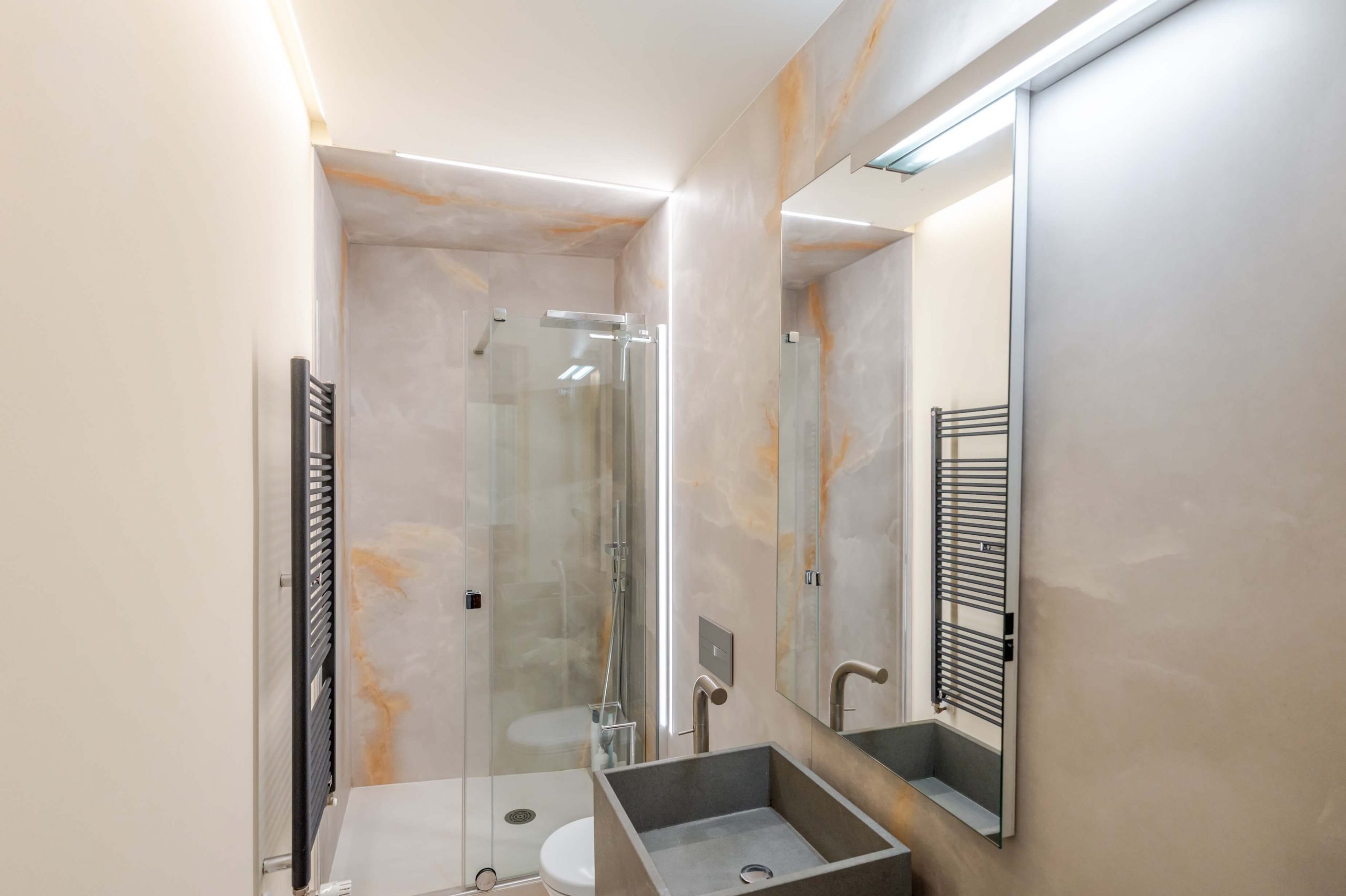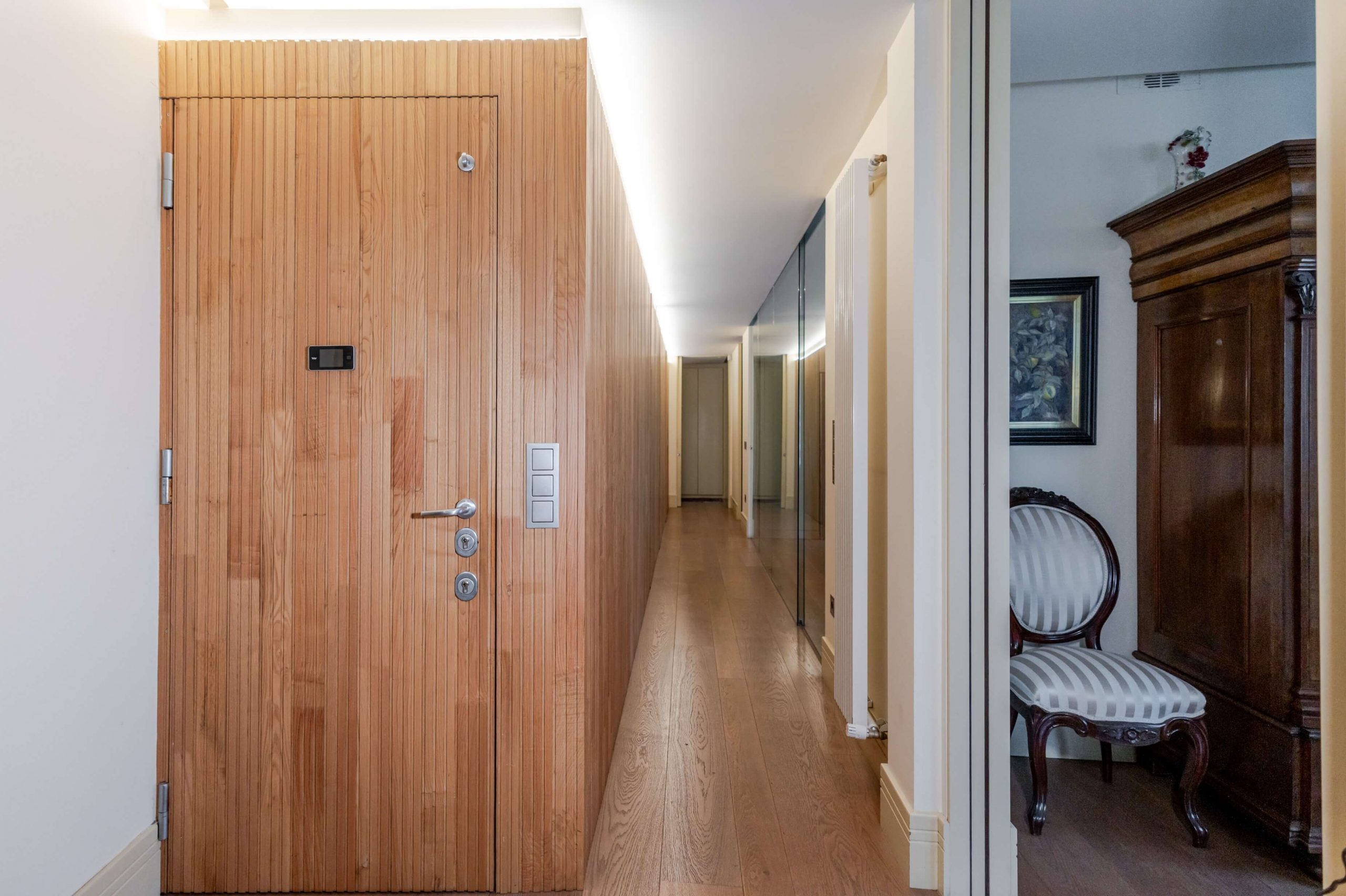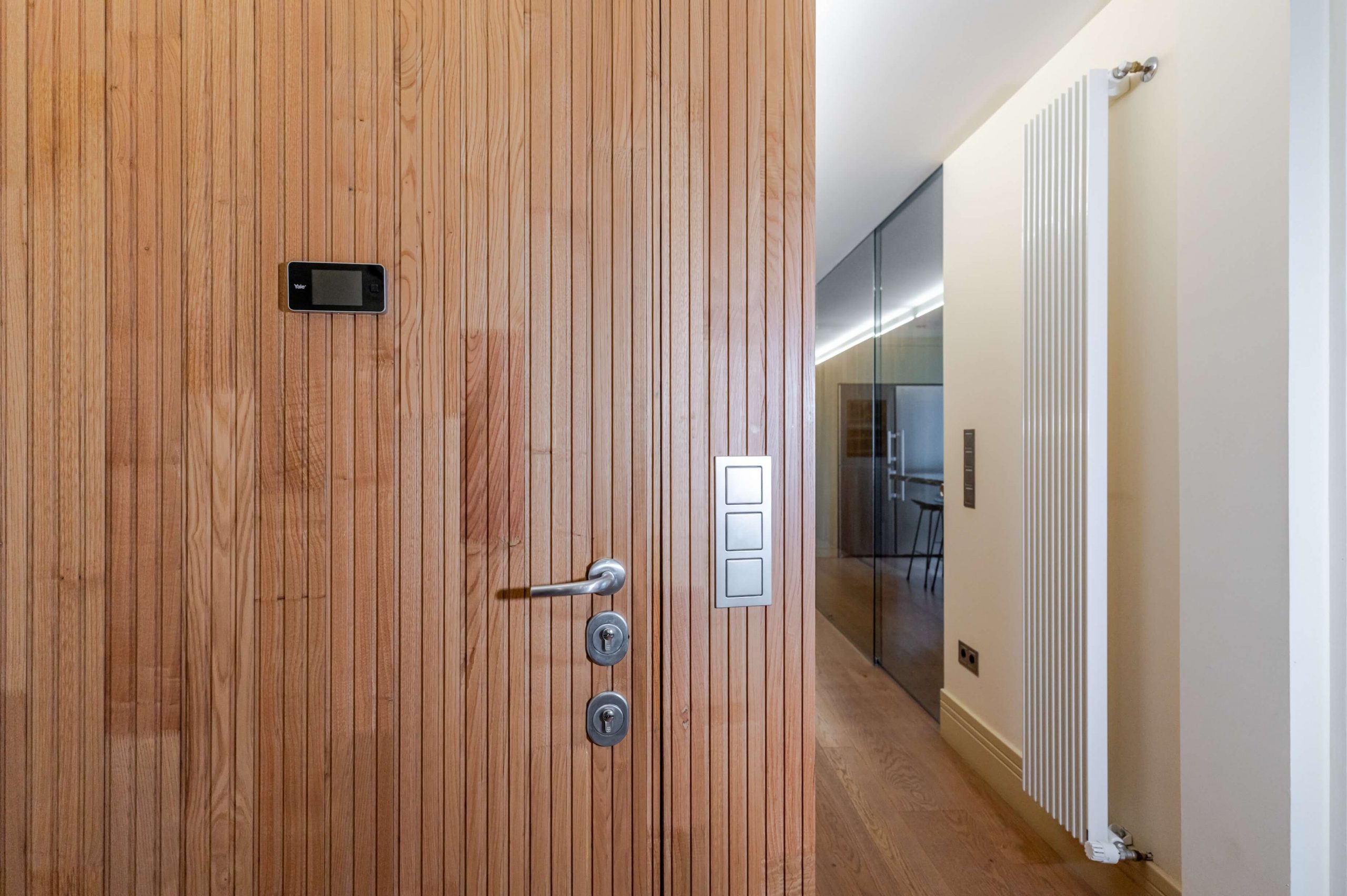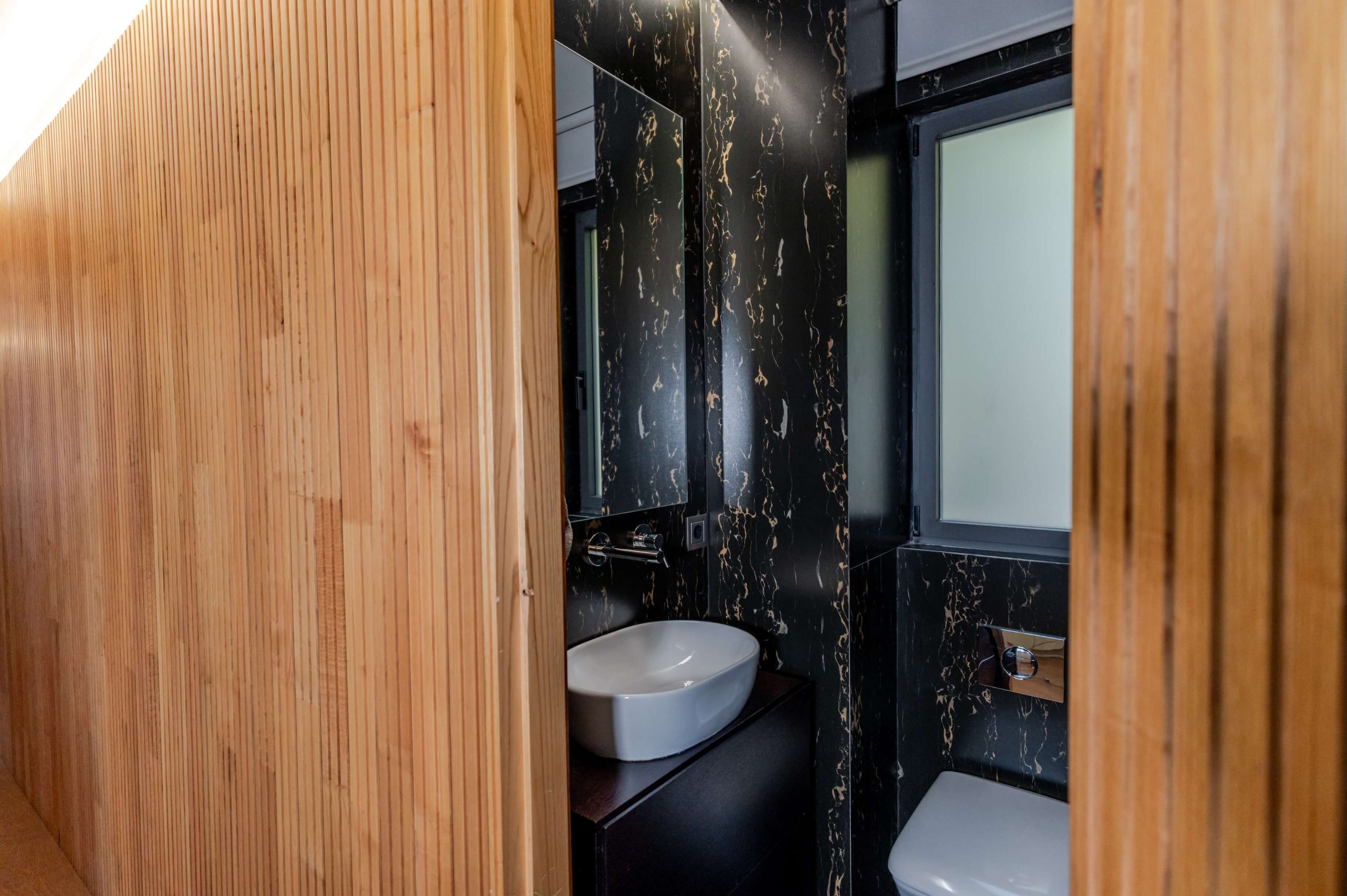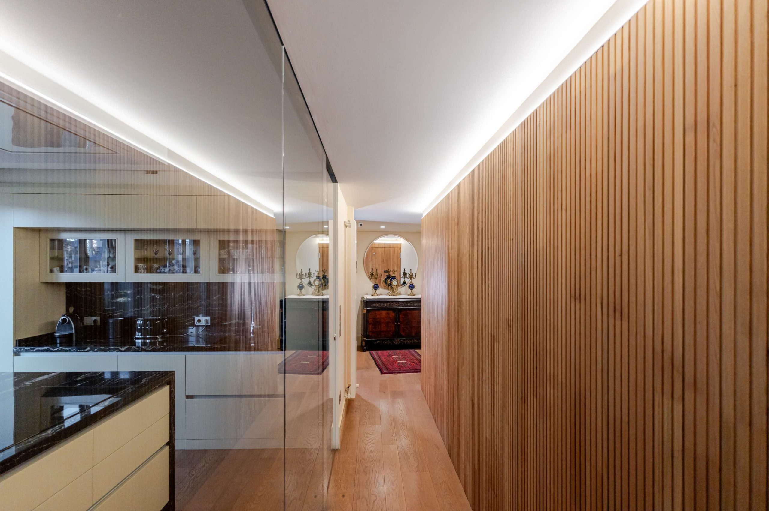 Las estancias ubicadas a la zona secundaria (que no cuentan con vistas) son las zonas no principales para los promotores: un dormitorio de invitados, zona de lavado y aseo. Se encuentran “ocultos” mediante un acabado del distribuidor de madera -incluidas las puertas-, con lo que conseguimos un pasillo homogéneo, que no se ve interrumpido por el ritmo de las puertas y que por tanto no rompe la estética que se buscaba conseguir.