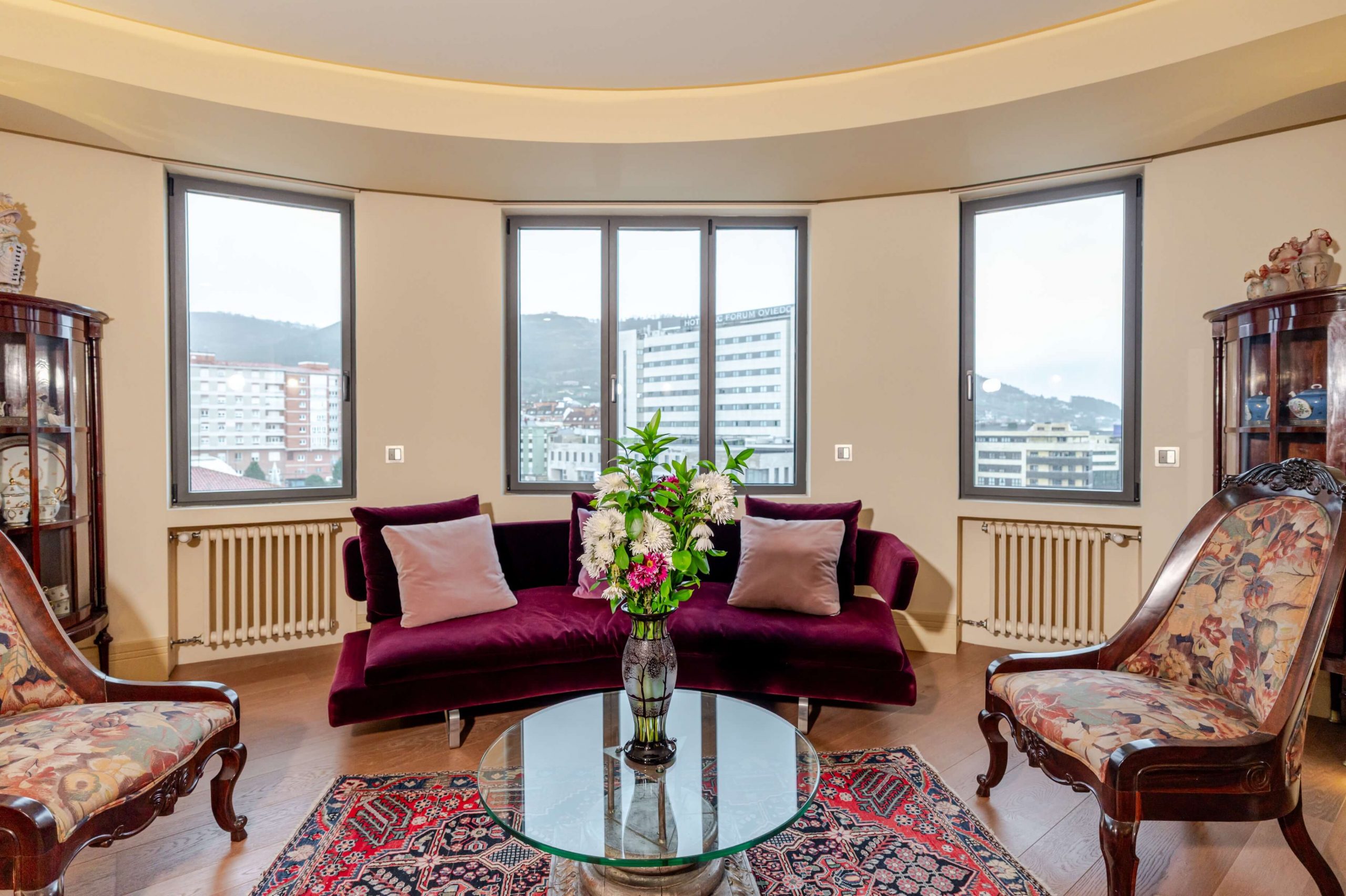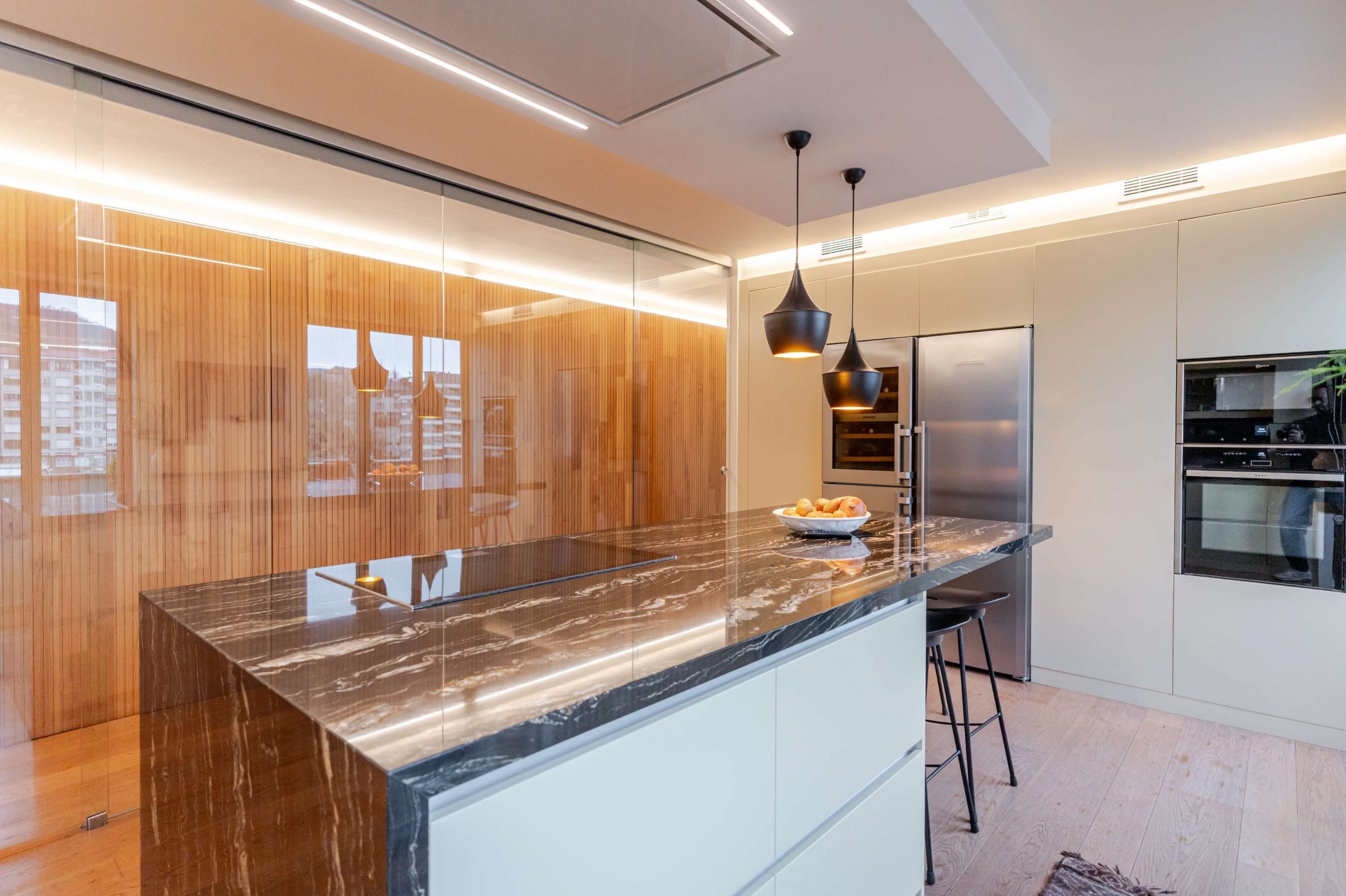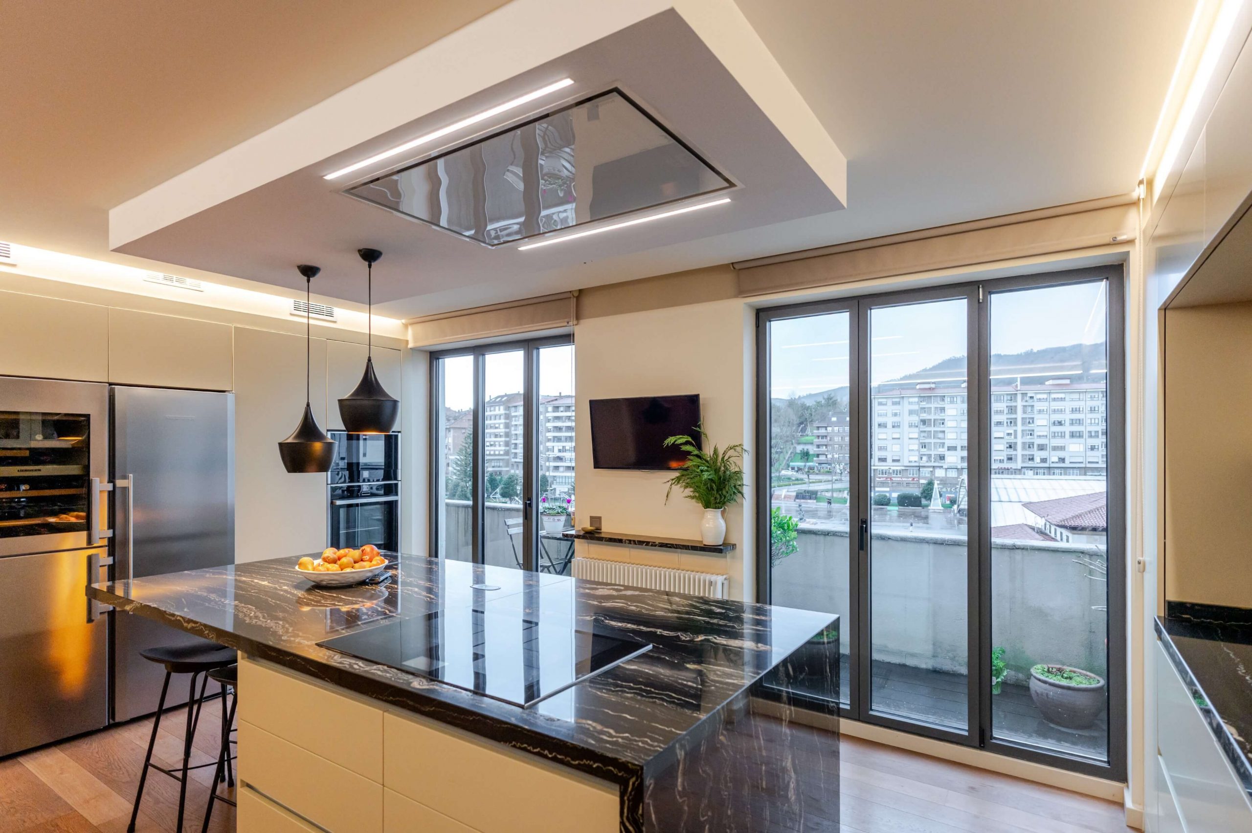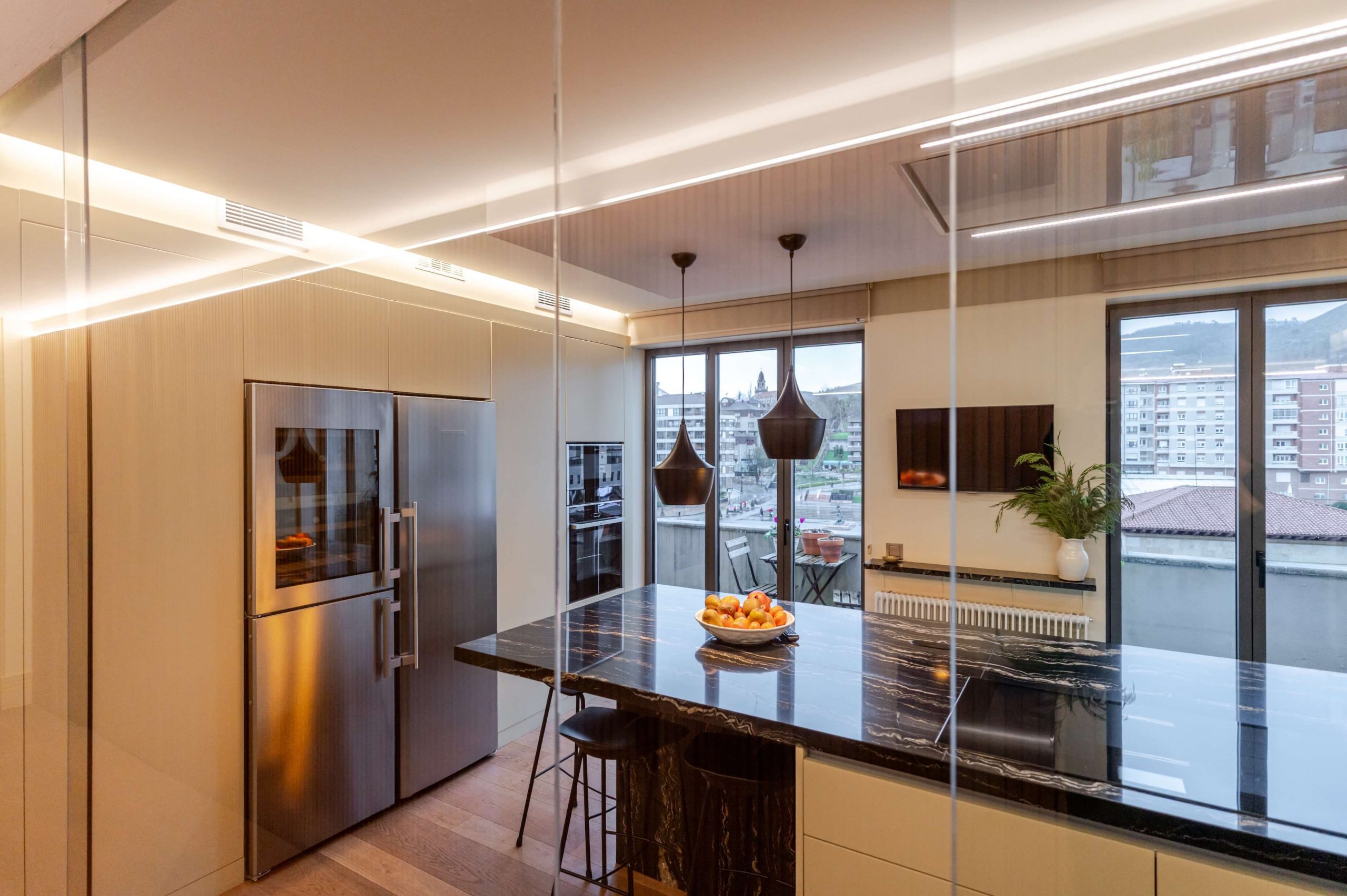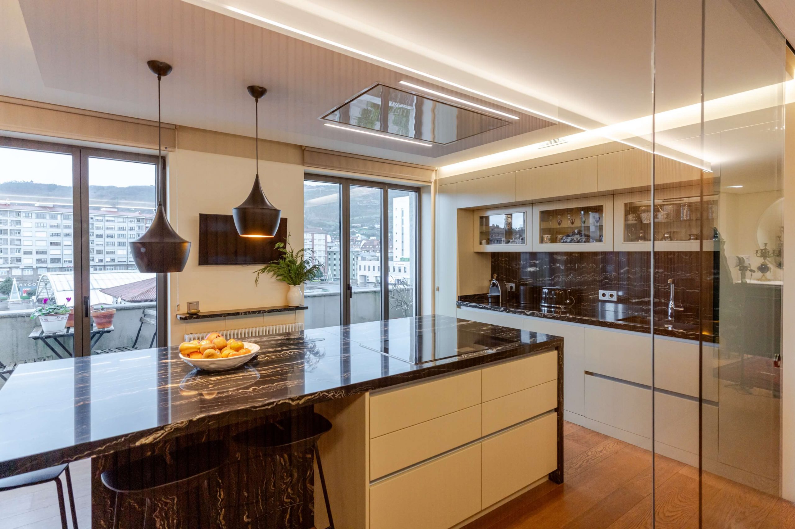 Siempre tenemos en cuenta la gran importancia tanto de la luz natural como de las vistas, y este piso es perfecto en ambas. Al estar ubicado al final de la calle Uría en cruce con la Avenida de Santander, dispone de una gran amplitud de vistas hacia el monte del Naranco. Estas vistas y la entrada de luz se magnifican al colocar ventanas con un perfil metálico reducido que amplían la superficie de vidrio disponible en el hueco.