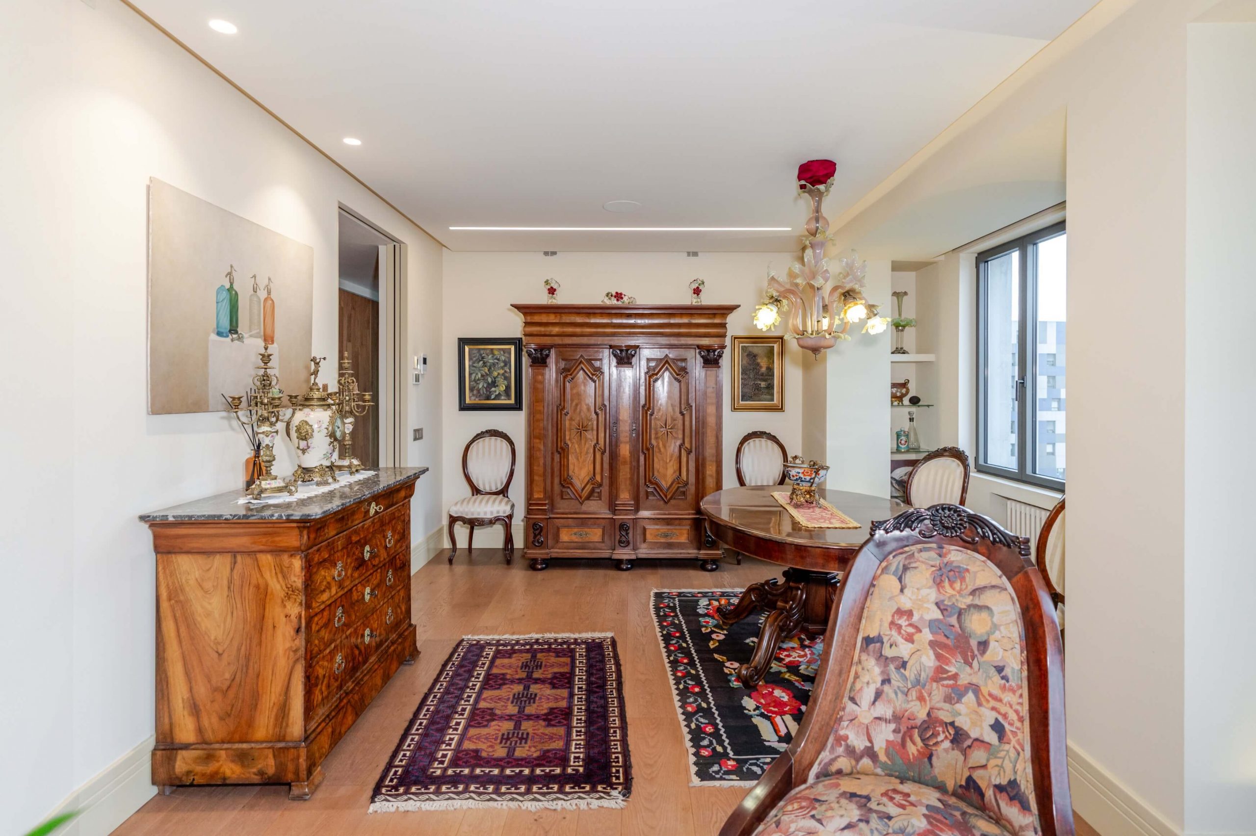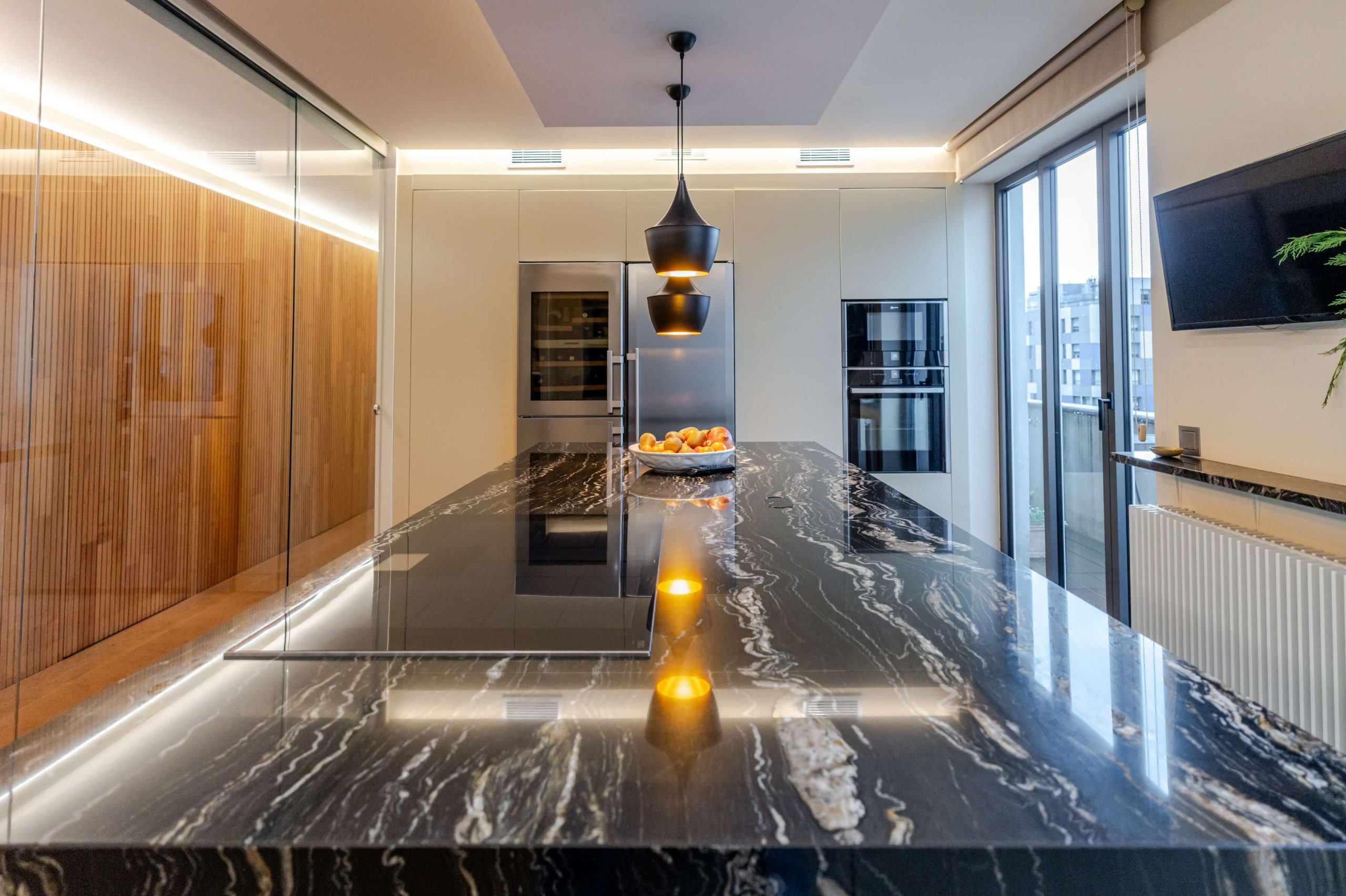 A ambos lados de la cocina se ubican las otras zonas que más importancia buscaban dar los promotores: el salón-comedor, el despacho y el dormitorio principal. El salón se ubica en la zona curva del edificio, dotándolo así de dos zonas diferenciadas dentro de un mismo espacio de 46 m2. El dormitorio principal se distribuye por las dos zonas del piso, al ubicar dentro del mismo espacio el baño con vestidor, creando así un hábitat individual del resto del piso.