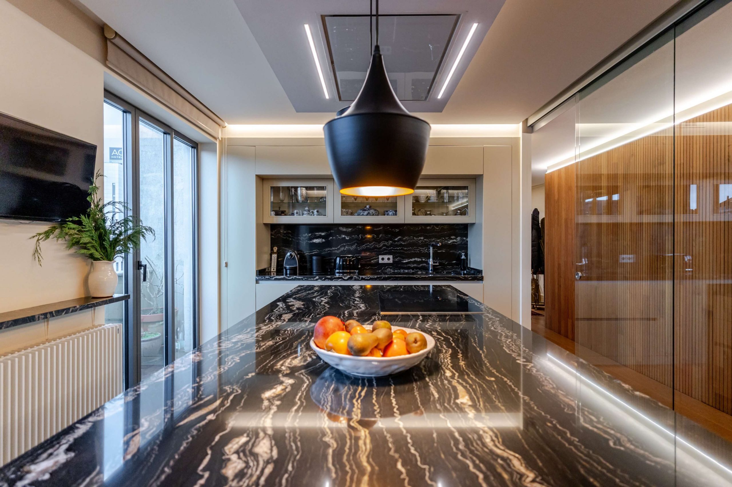 Nuestra propuesta se basó en mantener la linealidad presente del pasillo, pero abriéndolo a la cocina, que ahora se ubica en el lugar central de la vivienda. Además, al cerrarse la cocina mediante una pared de vidrio con puertas también de vidrio, no existe nunca la sensación de un pasillo simplemente distribuidor de las zonas.