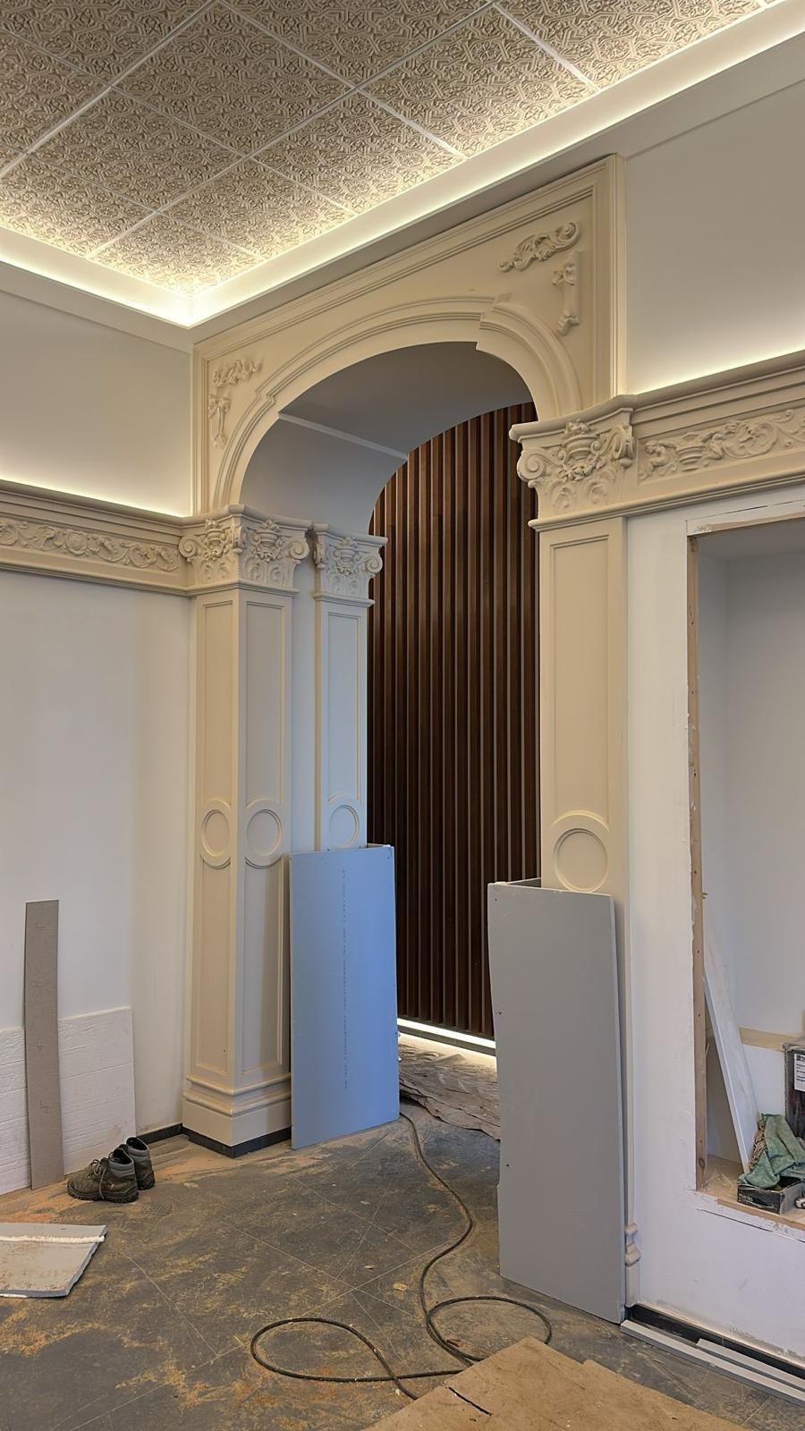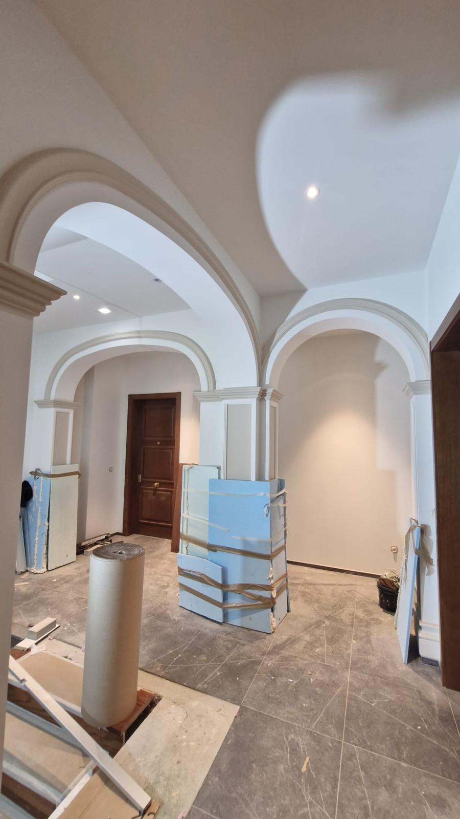 Como criterio de actuación, dada la aparición de algunas molduras en paredes y techos de algunas salas, se ha optado por recuperar estos dos elementos en el espacio principal de cada piso. Para ello, se ha unificado en un único espacio, de gran dimensión (unos 35-40 m2, y casi cuatro metros de altura), el salón, comedor y cocina, de tal forma que estas molduras puedan tener cierta presencia. Para reforzar este criterio de diseño, se prevé un cierre acristalado de las cocinas, que permita leer el gran espacio unitariamente.