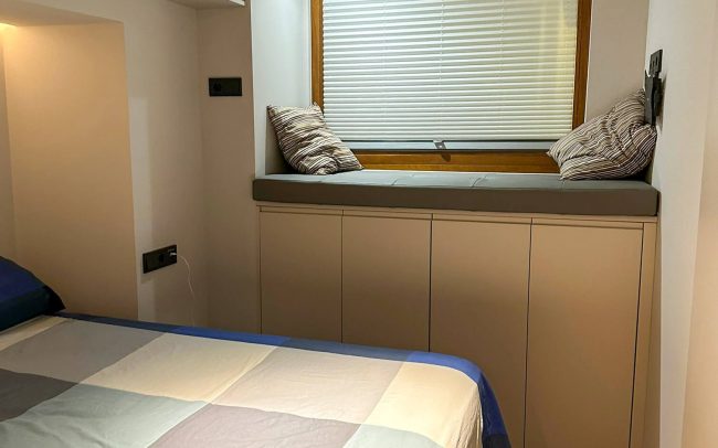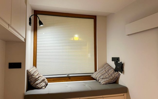En este caso, por ser una zona ruidosa, se han introducido una ventana y una puerta de acceso de máxima calidad, de madera de iroko de 90 mm de sección con triple vidrio.