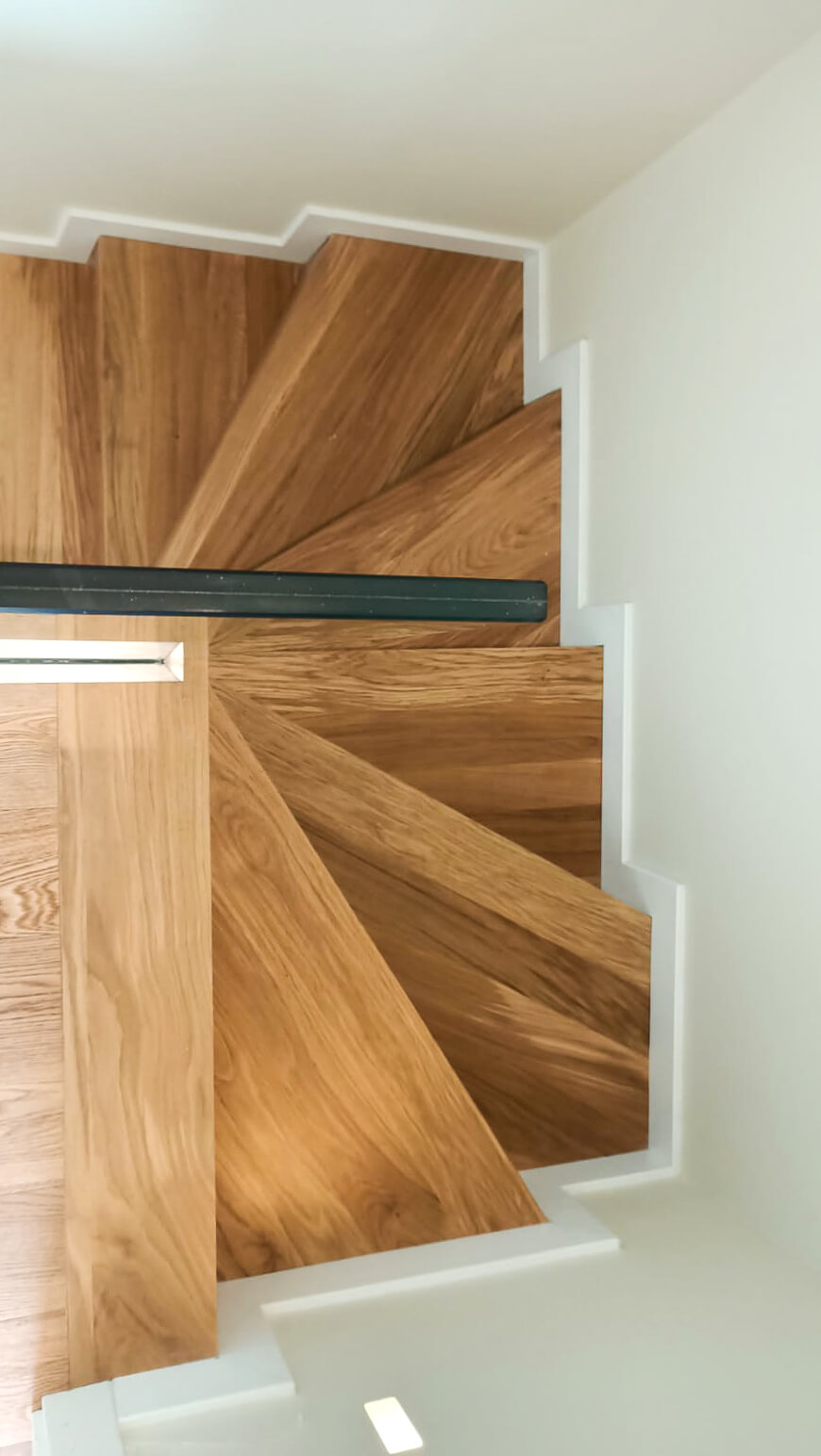 El programa interior se divide en dos plantas sobre rasante, situando los espacios vivideros en planta baja y la zona de noche en planta primera, y separando en la planta alta el dormitorio principal del resto mediante una doble altura, para obtener así una mayor intimidad.