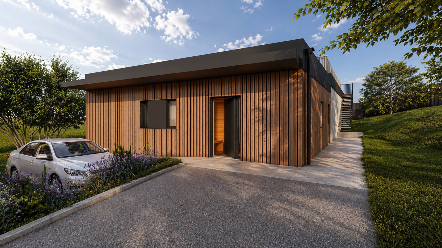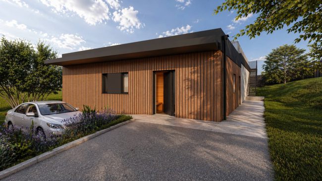 Debido a la pendiente del terreno, el edificio se sitúa en la cota media (+29.00), quedando parcialmente semienterrado en una zona y elevado unos 50 cm en la opuesta. Esta solución minimiza los movimientos de tierra, respeta la morfología natural de la parcela y facilita una transición fluida entre interior y exterior.