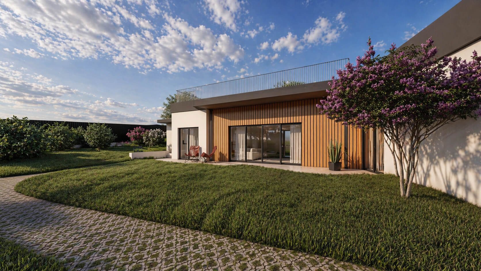 La vivienda se complementa con espacios exteriores como un porche y una terraza en cubierta, pensados para su uso a lo largo del año.
