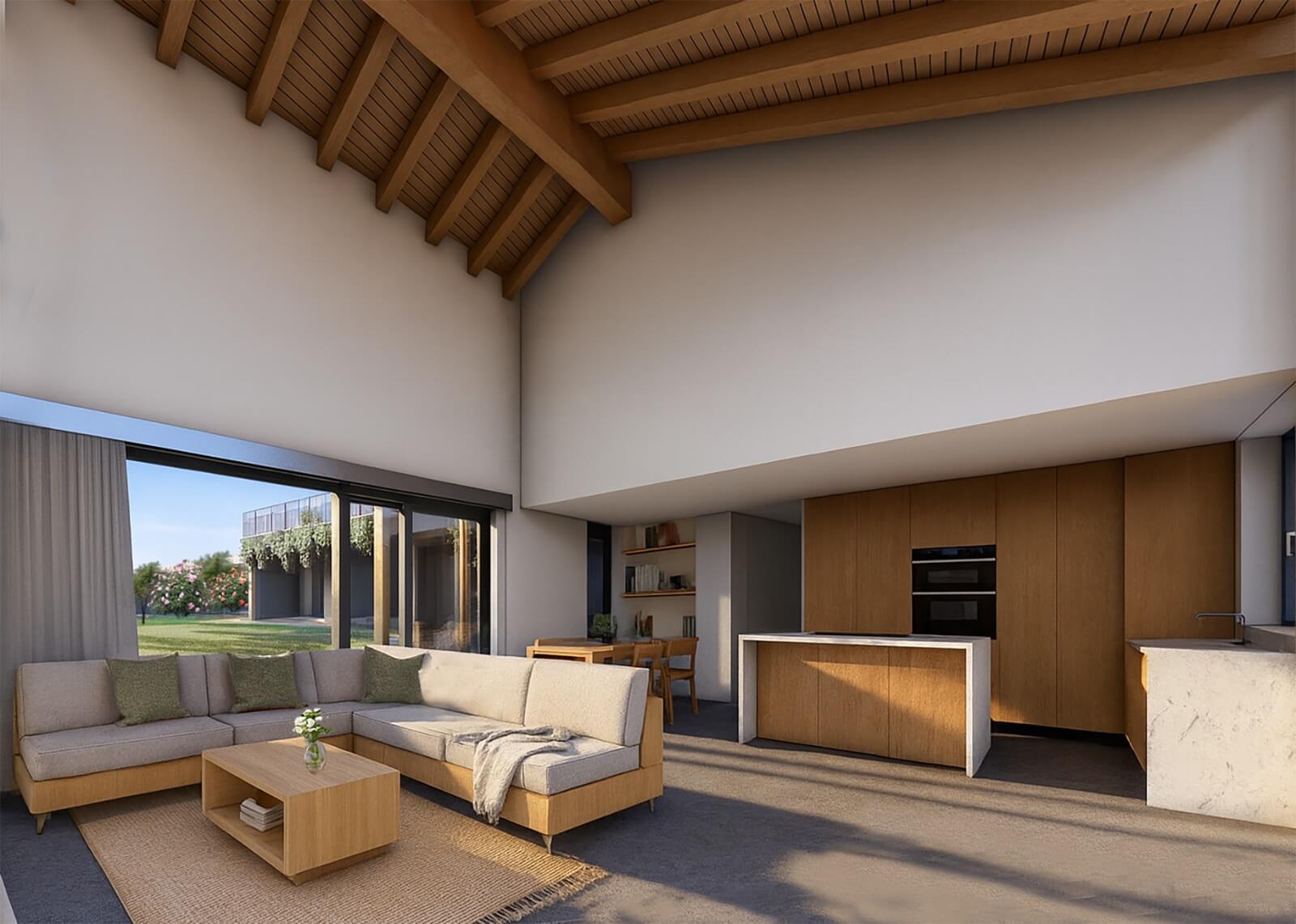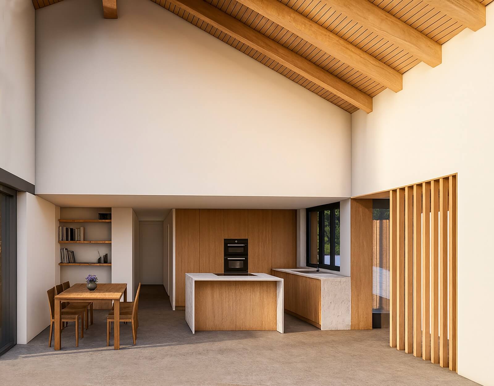 Se plantea una apertura estratégica hacia el sur – suroeste, favoreciendo el acceso a la luz natural y las visuales destacadas desde el interior de la vivienda. Asimismo, se proyectan espacios exteriores como terrazas y porches, que permiten disfrutar del entorno en diferentes épocas del año, adaptados al uso funcional y climático del lugar.