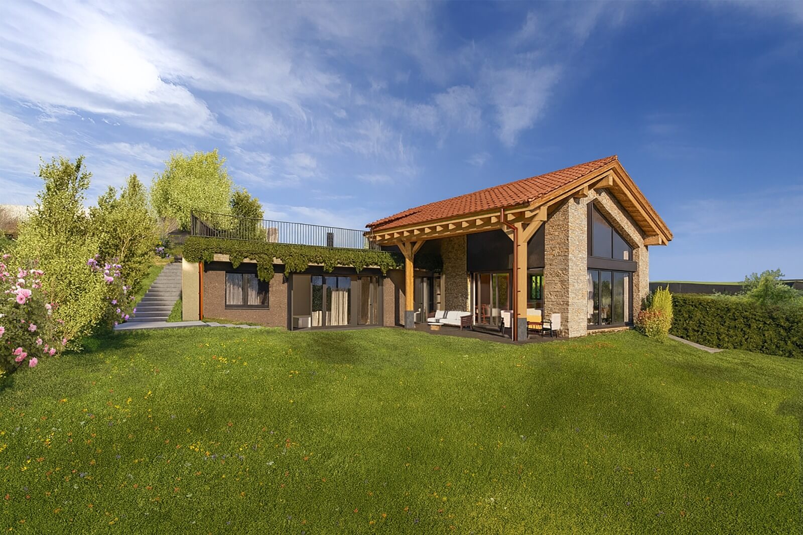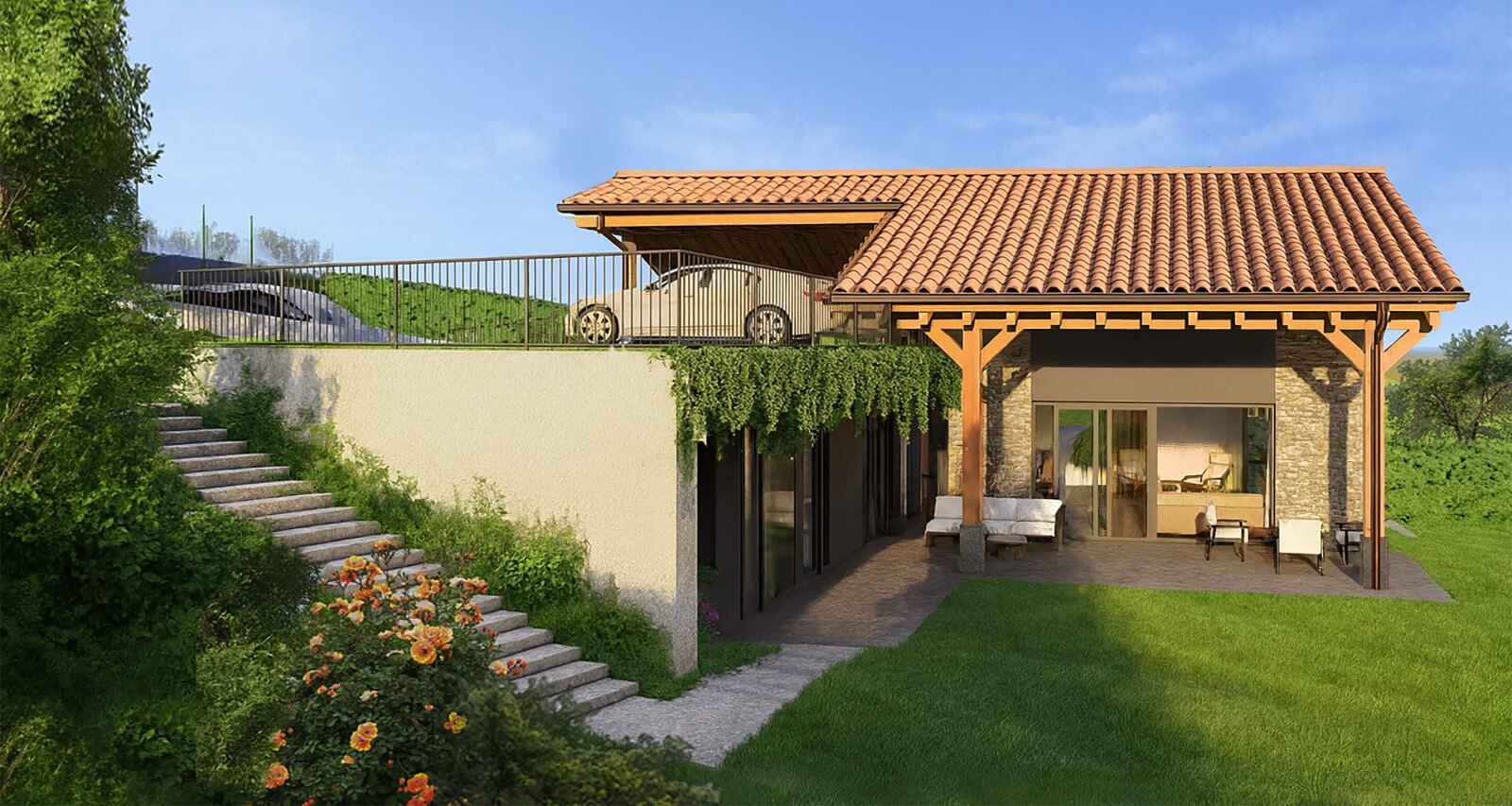 La vivienda se adapta a las condiciones topográficas de la parcela, caracterizada por pendientes pronunciadas, mediante una implantación semienterrada que minimiza el impacto visual y favorece su integración con el entorno. Esta solución permite reducir los movimientos de tierra, respetar al máximo la morfología natural del terreno y mejorar el comportamiento térmico de la edificación al aprovechar la inercia térmica del suelo. Además, se diseña un acceso cómodo y funcional, así como una conexión fluida entre los niveles interiores y los espacios exteriores, creando y porches que aprovechan las características del terreno para usos complementarios al programa de la vivienda.